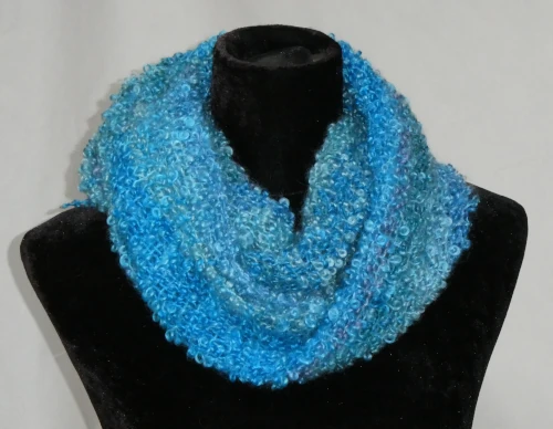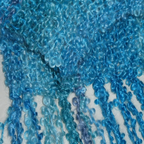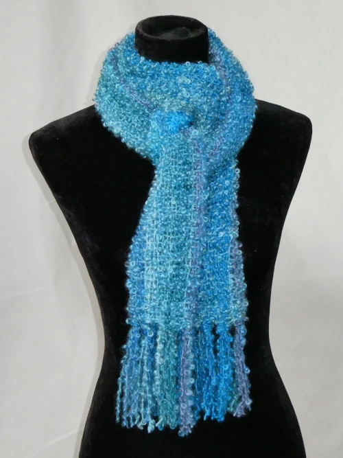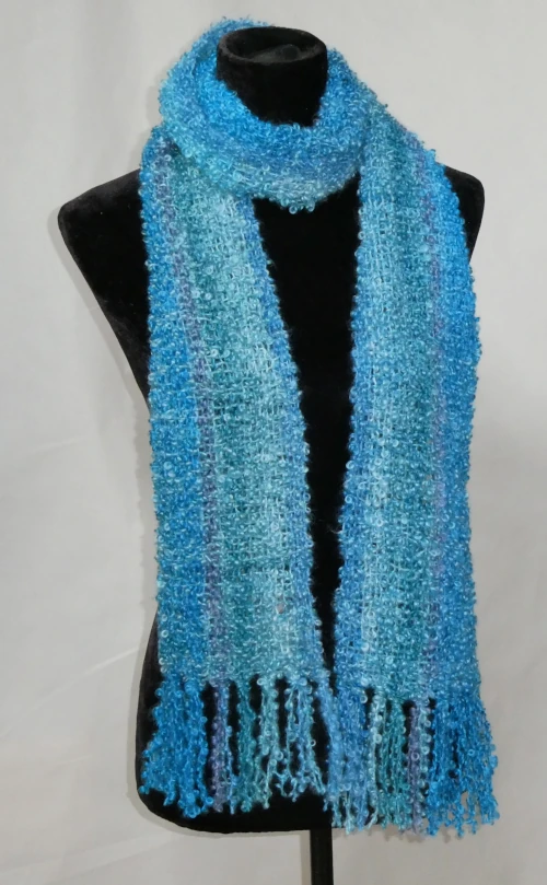 This scarf combines hand dyed shades of soft green and aqua in a striking palette. Woven from luxuriously soft bouclé yarn, it has a silky, lightweight texture that feels beautifully soft against the skin. Perfect for chilly days, it adds a cosy layer and a splash of colour to any outfit.