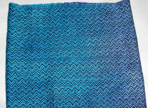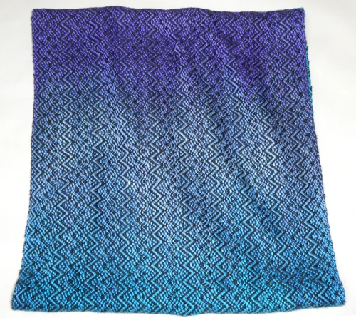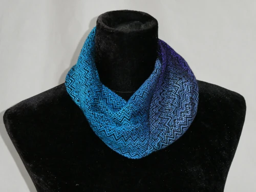 I have hand-dyed this cowl in subtle shades of blue and purple. It is woven in a striking pattern with black Tencel, creating contrast and depth. The blend of 50/50 merino and silk with Tencel gives it a beautifully soft feel. Finished with a flat seam, it offers a comfortable and refined fit.