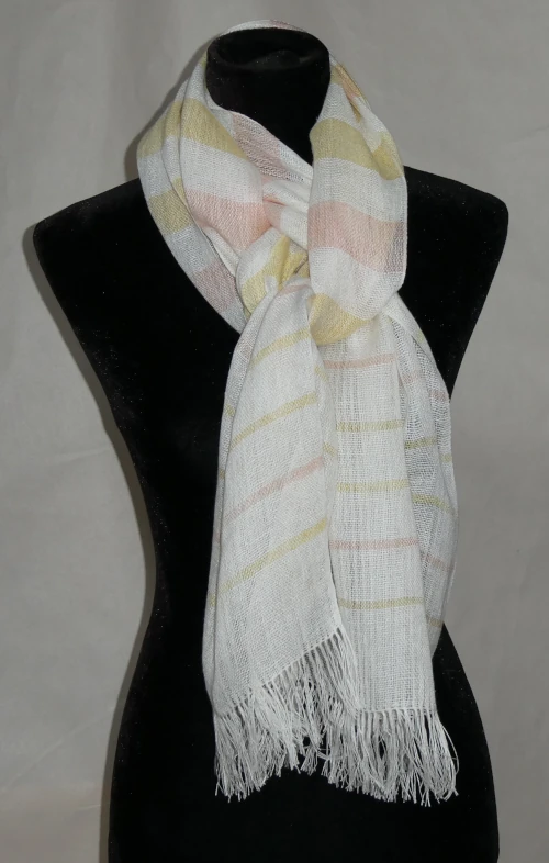 The design begins with delicate pastel pinstripes at each end, leading to bolder, thicker stripes through the centre—a simple yet striking detail. The scarf is finished with hemstitching and a short fringe, adding a subtle, refined touch.