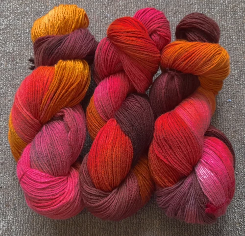Each skein is hand dyed in small batches, so subtle variations in colour make every one unique.