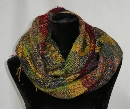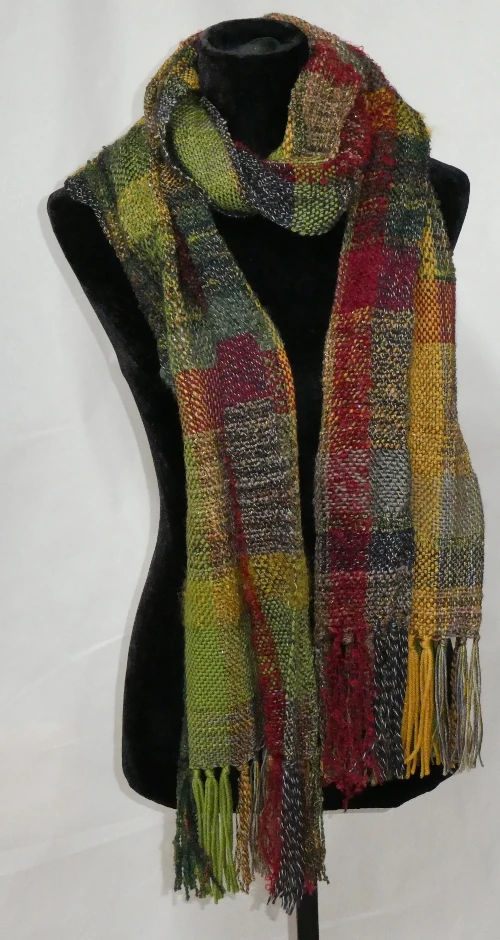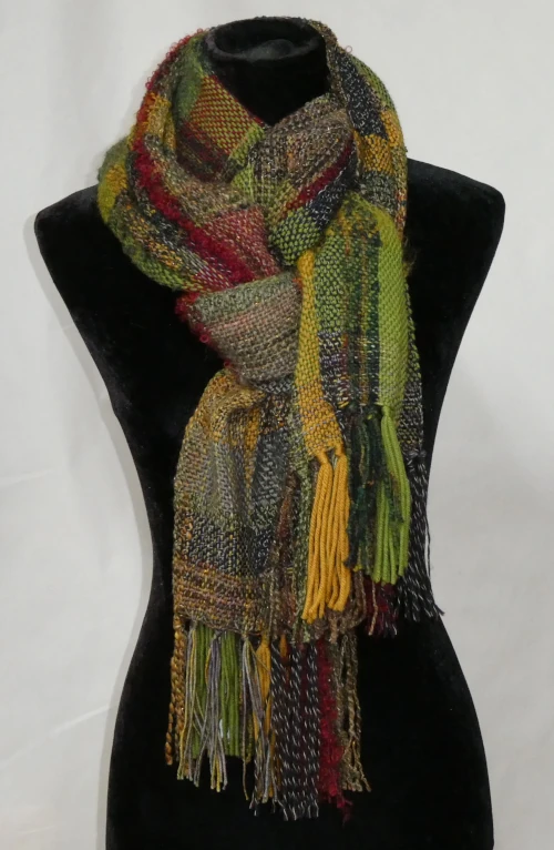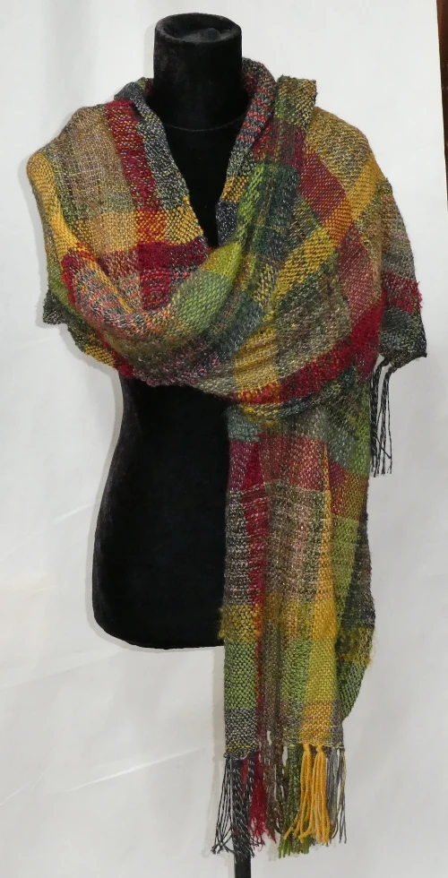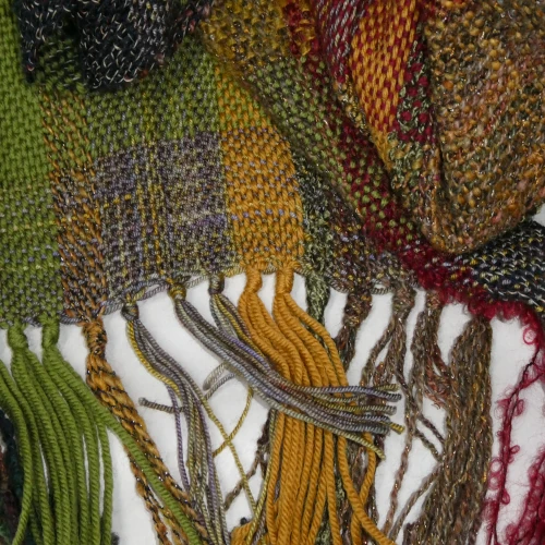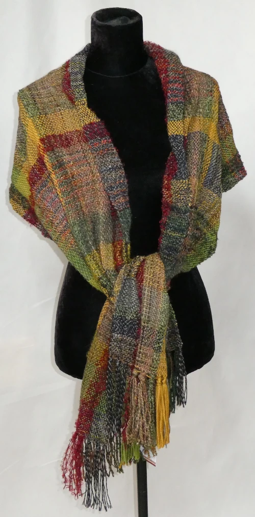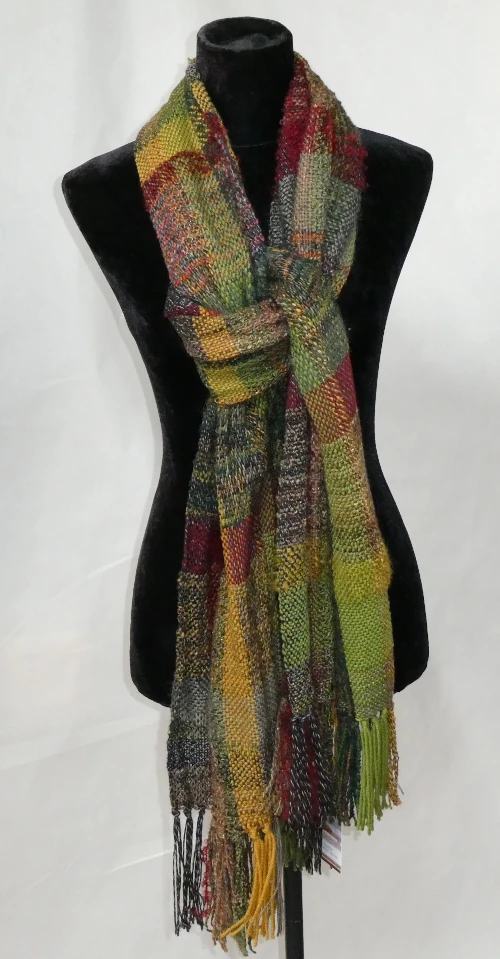 This gorgeous oversized scarf has been woven from a rich mix of autumnal shades, combining some hand dyed and hand spun yarns for a beautifully layered, textured effect. Each yarn contributes its own unique character, creating a scarf that feels both artisanal and luxurious. The fringe is finished with overhand knots.