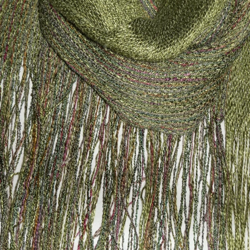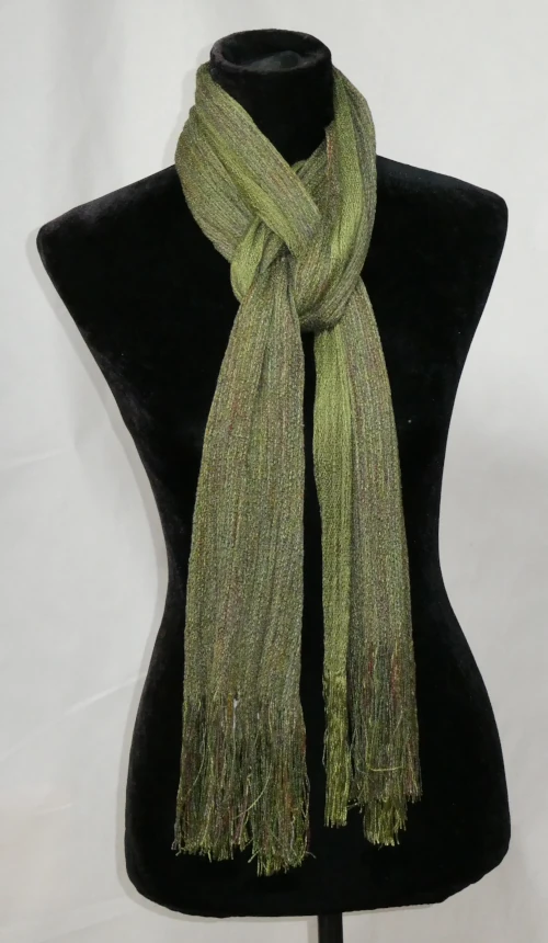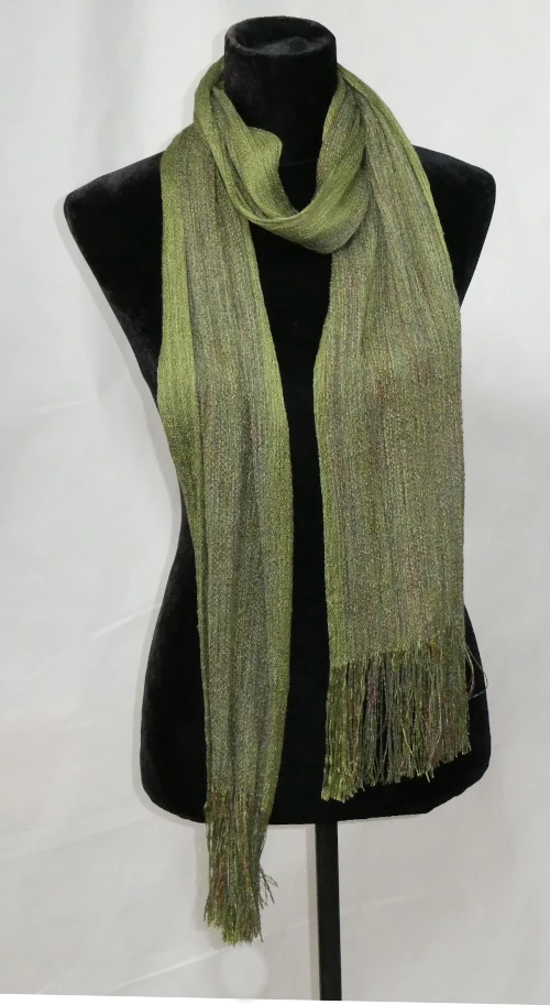 I’ve woven this scarf from a soft olive-green Tencel paired with hand-dyed rayon in complementary shades, creating a harmonious, textured blend. Lightweight and fluid, it drapes beautifully, adding subtle colour and a touch of elegance to any outfit.