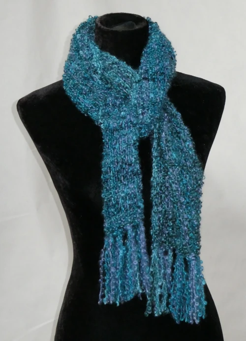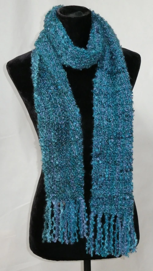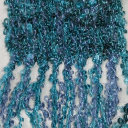 This soft mohair bouclé scarf is hand-dyed in a palette of teal, green, and light navy blue. Lightweight and silky to the touch, it drapes beautifully while providing a cosy, comforting layer. Perfect for adding subtle colour and warmth to any outfit.