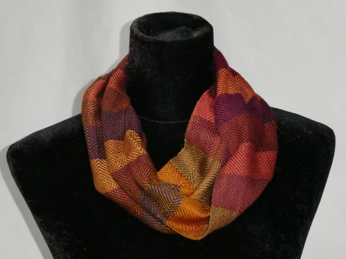 I’ve woven this cowl from a hand-dyed 50/50 merino and silk yarn, complemented by stripes of Tencel that add contrast. Soft and lightweight, it feels gentle against the skin while offering a cosy layer of warmth. The piece is finished with a neat flat seam for a clean, comfortable fit.