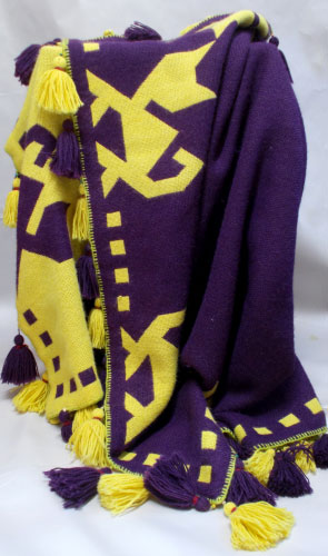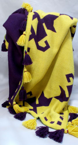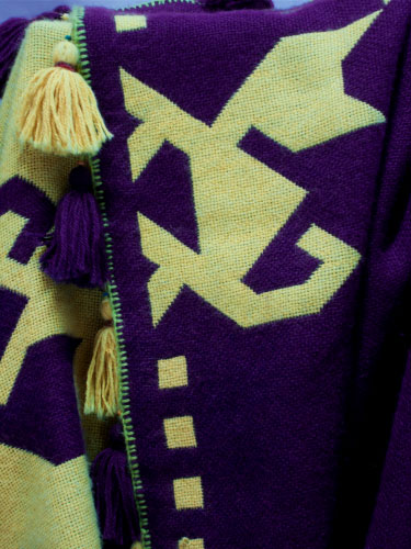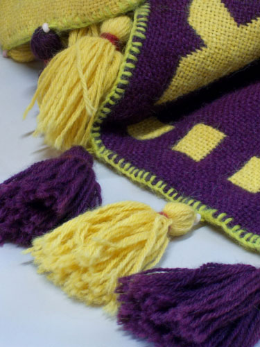 I knew I needed two very contrasting colours to make the pattern stand out and to make the weaving easier to do, so chose a deep purple and bright yellow. Not wanting a fringe on the blanket meant tucking the ends back between the two layers then in a lime green alpaca yarn, blanket stitching all the edges. The finishing touch was making tassels and sewing these on with a bright bead to the edges of the blanket.