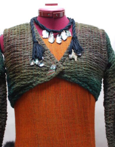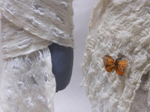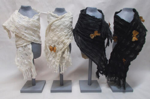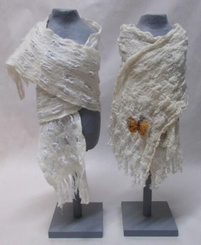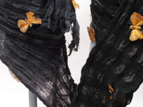 Each wrap was woven with a different weave in New Zealand wool and tencel. The first and last in the series were felted after being woven, creating little squares of unfelted tencel. The middle two wraps were both woven with a wool lycra thread added to give a textured effect. After all four wraps were completed I ripped holes and pulled threads in them to give the impression of being moth eaten. The finishing touch was to decorate them with brown moths created from feathers.