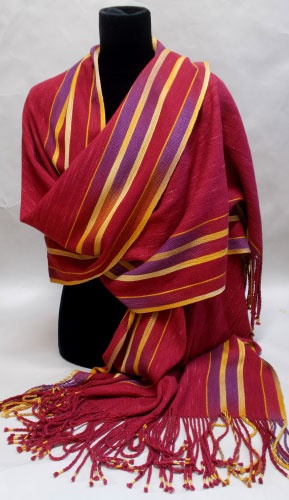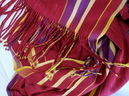 The Indian Dream Silk Wrap is woven from two different types of silk yarn. In the main part of the wrap I have used a silk noil yarn, which has no shine to it at all and a slight uneven texture. The golden stripes are woven using a cultivated mulberry silk yarn, that has the lovely sheen that we associate with silk. I have also used the silk noil yarn for the painted ikat style accents. This wrap is woven with a dark red cotton in a plain weave, with the golden stripes a warp faced weave. Instead of just a normal fringe on this wrap, I twisted the fringe into cords and wrapped silk around the ends to secure them.