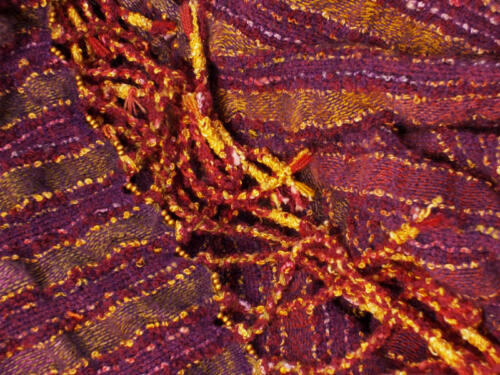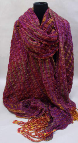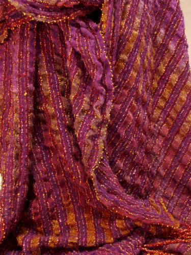 To give the mohair wrap some texture I incorporated four other yarns, a heavy, luxurious silk boucle that I dyed an old gold, a slub cotton thread in purples and deep pinks and a merino boucle yarn dyed a rich deep red. The final yarn is a wool lycra blend also dyed a deep red. This yarn when washed, shrinks considerably and creates a ripple effect throughout the whole piece. The wrap was woven with a 2ply merino wool dyed a deep purple.